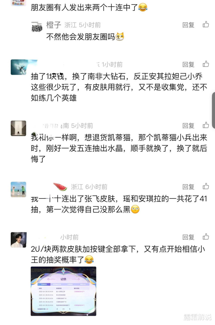 除了晒图的玩家,我在各大社交平台的评论区也看到了众多玩家对于这次抽奖概率的点赞,很多玩家都认为这次安琪拉和瑶妹的抽奖概率是不是提升了,怎么自己这次没有满抽就出了?